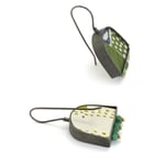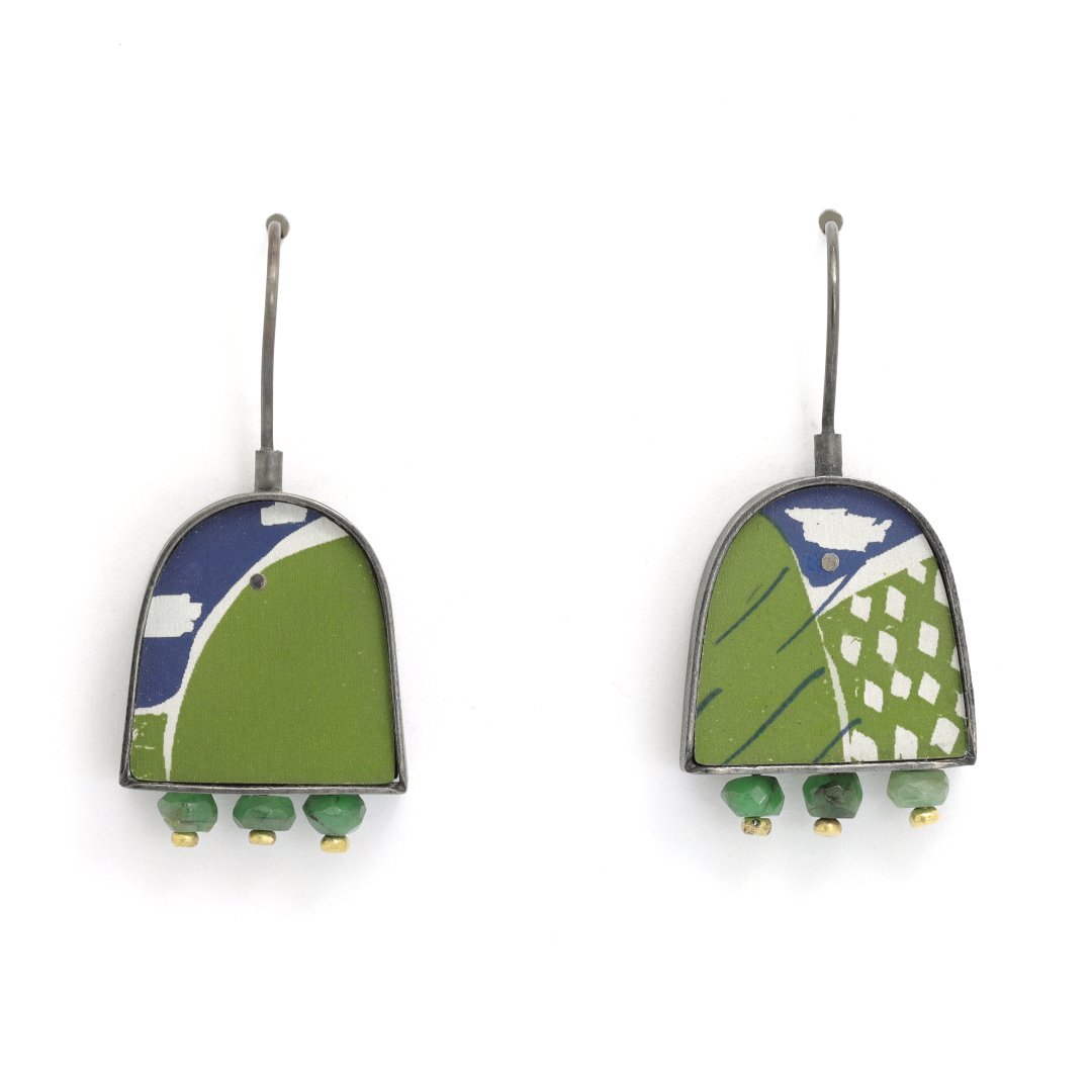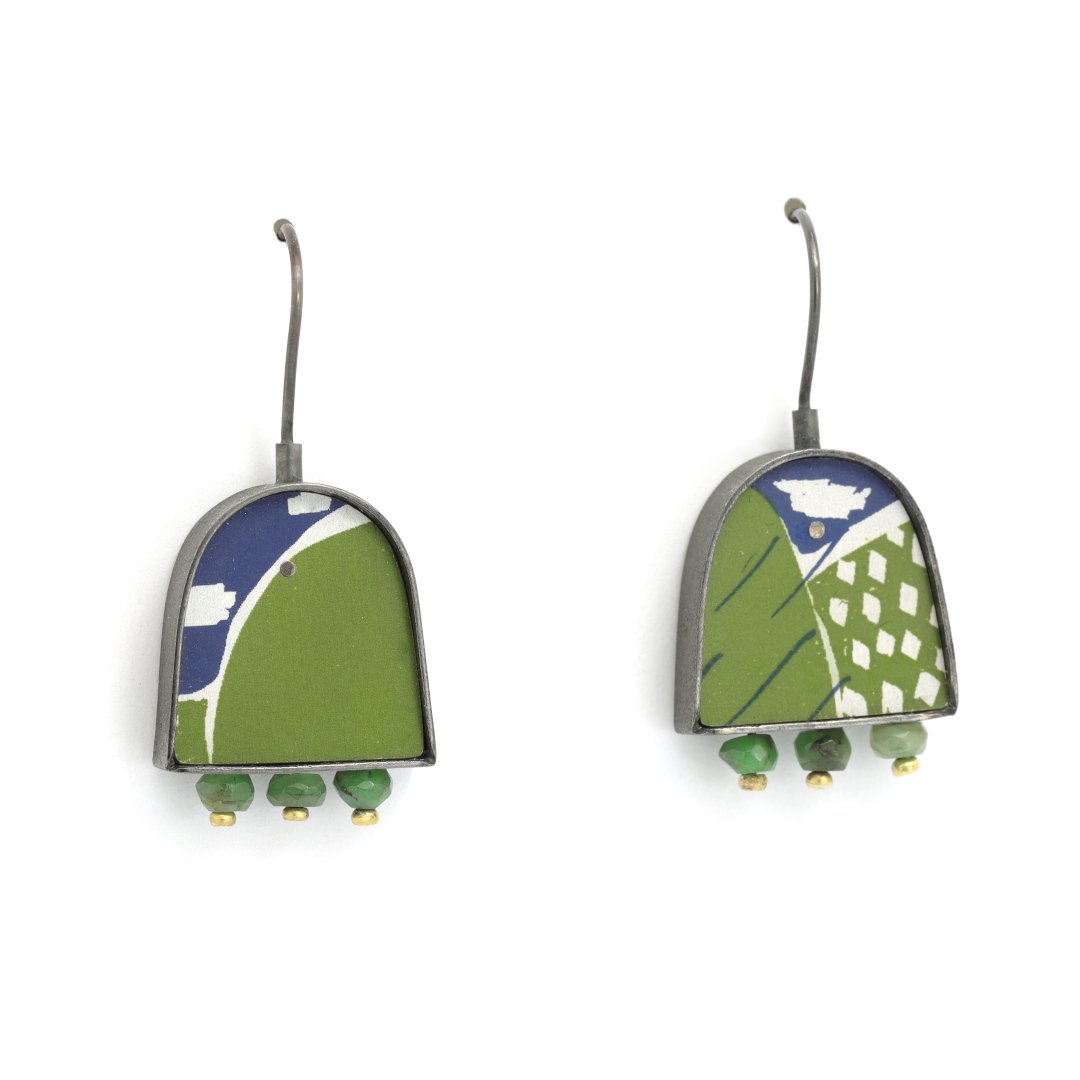 Comprised of patterned aluminium, hand-screenprinted with colour, framed in the dark tones of oxidised silver. These hollow forms are light on the ear and comfortable to wear, hanging from silver wire hooks.