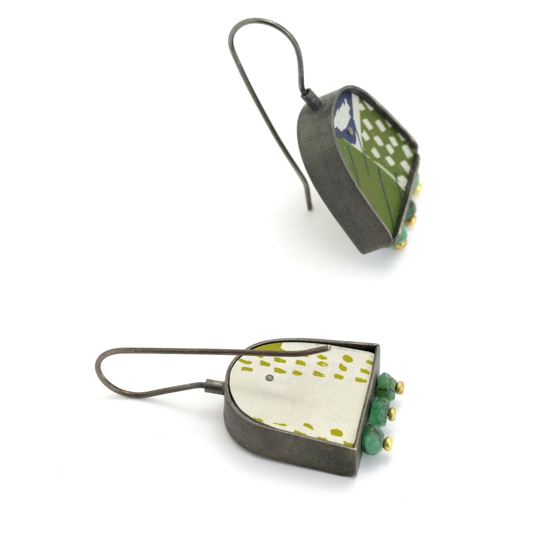Sterling silver and hand-printed anodised aluminium, a light yet strong and durable material with a smooth matt finish. Constructed using traditional metalwork and printmaking techniques, and assembled with tiny silver rivets. This pair feature faceted rough emerald beads hanging beneath with 18ct detailing.