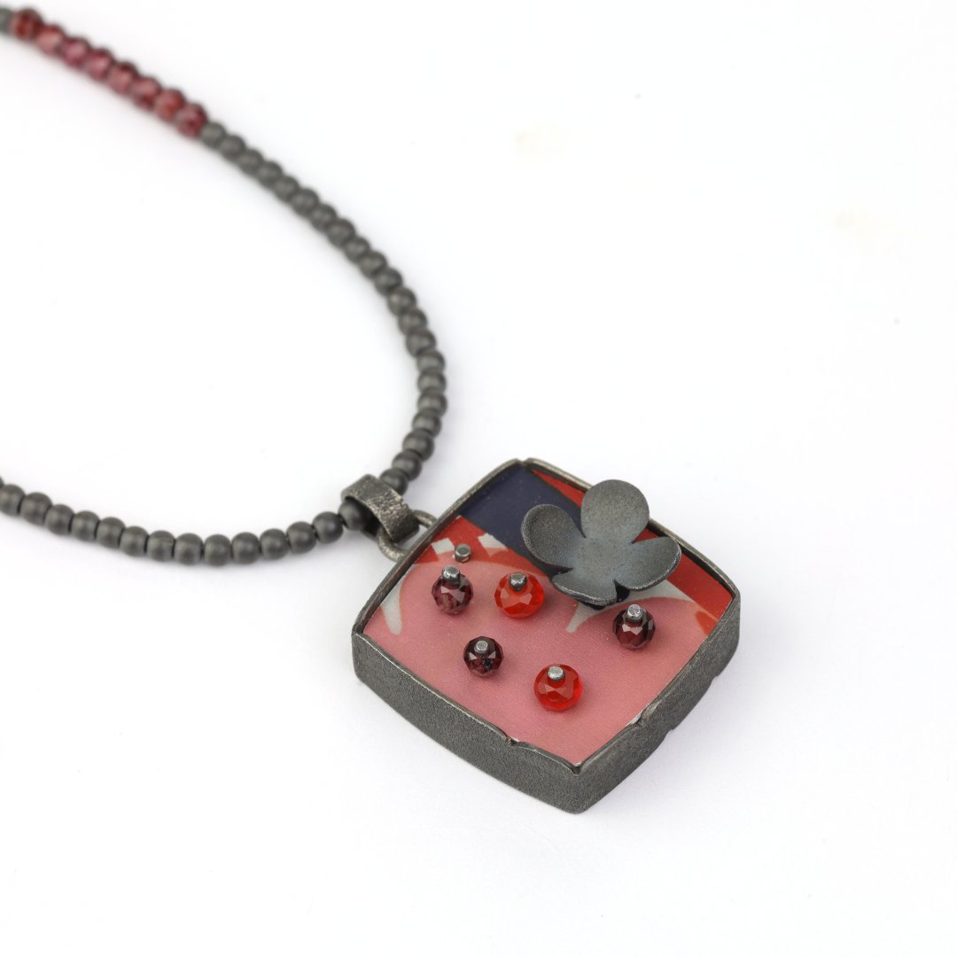 This little Framed Pendant combines screen-printed anodised aluminium with the dark tones of oxidised silver. A small flower in oxidised silver is assembled on a pivoting stalk so that it turns to create an alternative arrangement and the print is peppered with garnets and red agate.